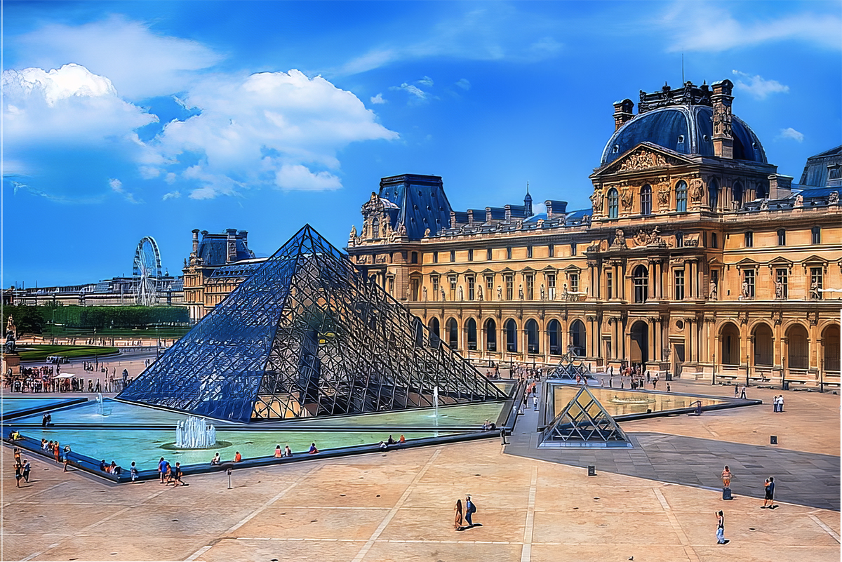 | Cấu trúc khung thép lối vào Bảo tàng Nghệ thuật Louvre Paris |
